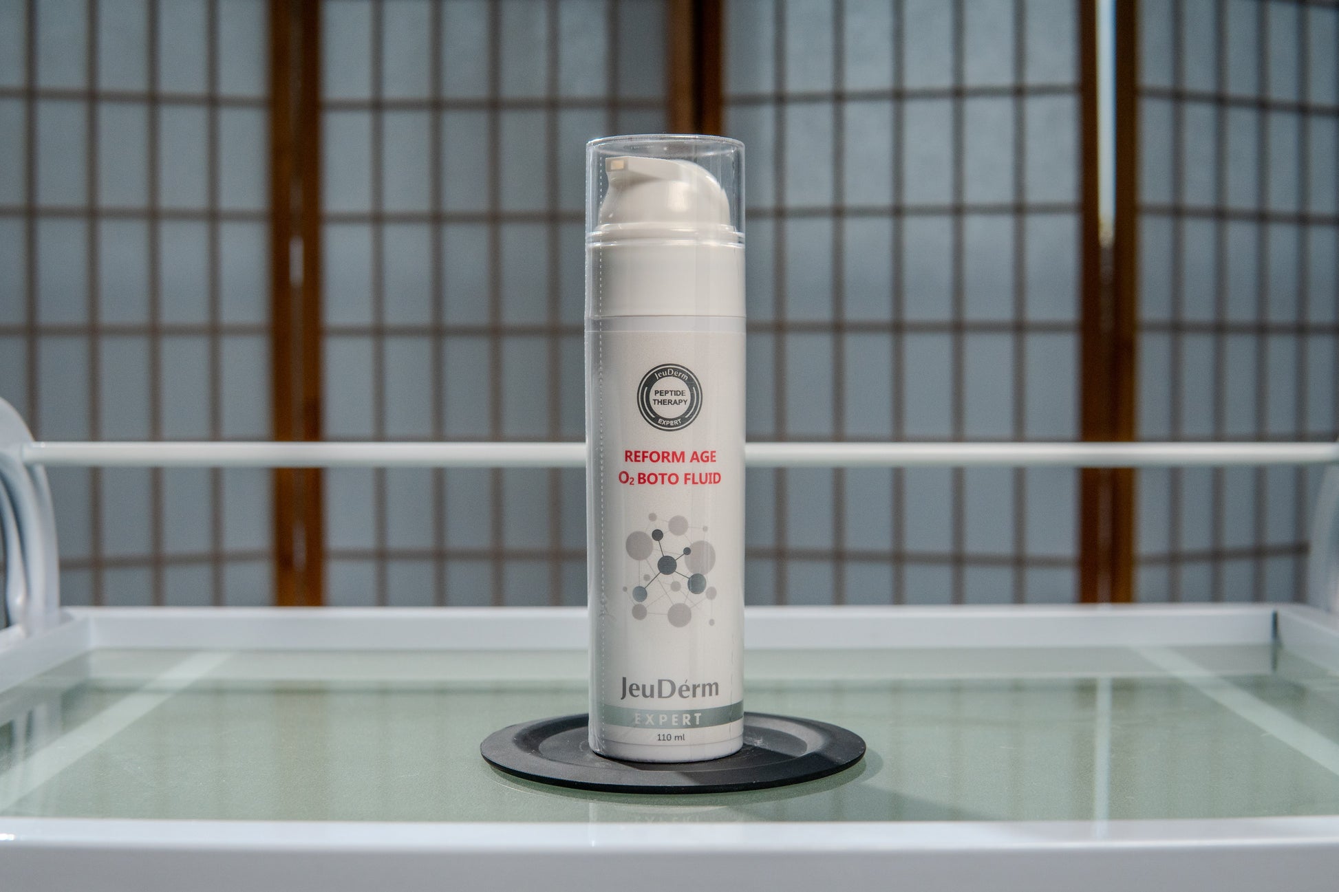 JeuDerm Reform Age O₂ Boto Fluid je inovativní liftingový fluid s okamžitým efektem, který využívá technologii „oxygen bubbling“ – jemného kyslíkového bublání na pokožce. Tento proces stimuluje mikrocirkulaci, okysličuje buňky a podporuje vstřebávání aktivních látek. Produkt napodobuje efekt botulotoxinu („botox-like“ účinek) a viditelně redukuje vrásky, zpevňuje kontury obličeje a zanechává pleť vyhlazenou, zářivou a pružnou.